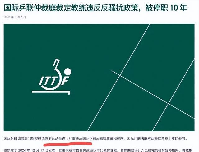 3月6日,海外乒联公布了一份走访叙述,叙述示意,一位名为徐克的乒乓球栽种,因性侵畅通员而严重违背了反混乱政策和递次。