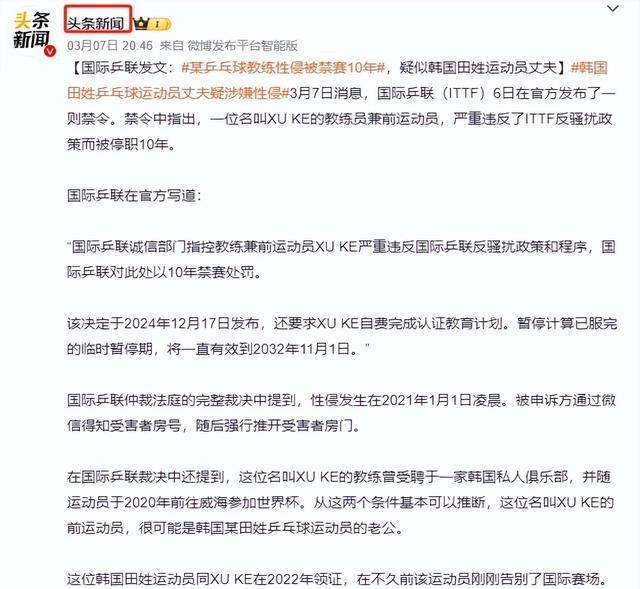 近日,海外乒联公布宣布示意,因一位名叫徐克的球员性侵他东谈主,将处以10年禁赛处罚。