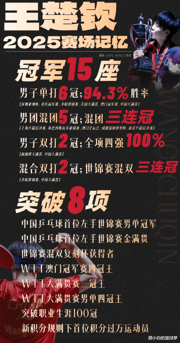 这个赛季王楚钦拿到15个冠军体育集锦,男人单打6个冠军,男人混团5个冠军,男人双打2冠,混双拿到2冠,王楚钦最大的成绩等于完成三大赛第一冠。