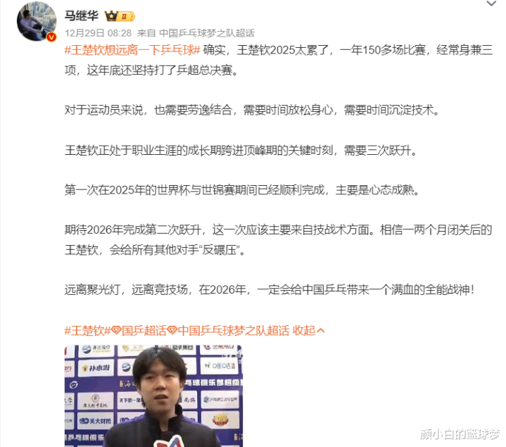 马继华也谈到王楚钦这个赛季:2025赛季王楚钦太累了,打了150场多场比赛,频频身兼三项,年底还带伤坚握打完乒超总决赛,他需要劳逸集会、抑制身心了。王楚钦处于糊口成永久越过巅峰的关节时刻,他还需要三次跃升。