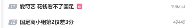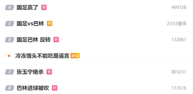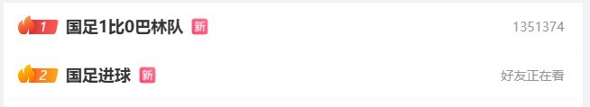 比赛收尾后,国足与巴林比赛的多条算计词条登上了微博热搜,其中登顶的是“国足1比0巴林队”,在微博热搜前十名当中,有7条是和这场比赛算计的。