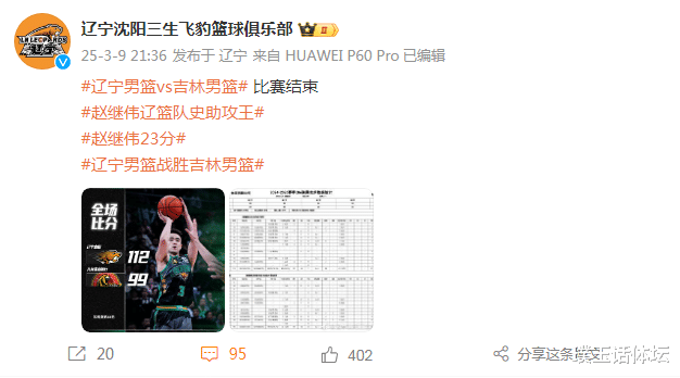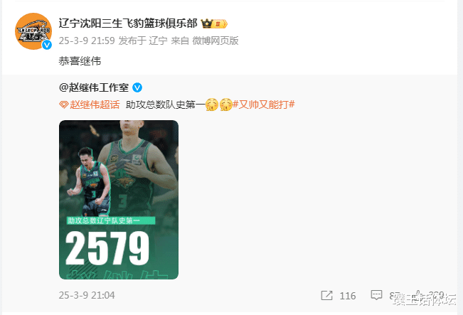 赛后比赛21点,辽宁男篮相聚发布两条最新讯息,21点36分,辽篮发文暗示:辽宁男篮校服吉林男篮,赵继伟23分,赵继伟辽宁男篮队史助攻王。随后在21点59分,辽宁男篮官方转发了赵继伟责任室:2579次助攻,又帅又能打,并留言恭喜继伟。