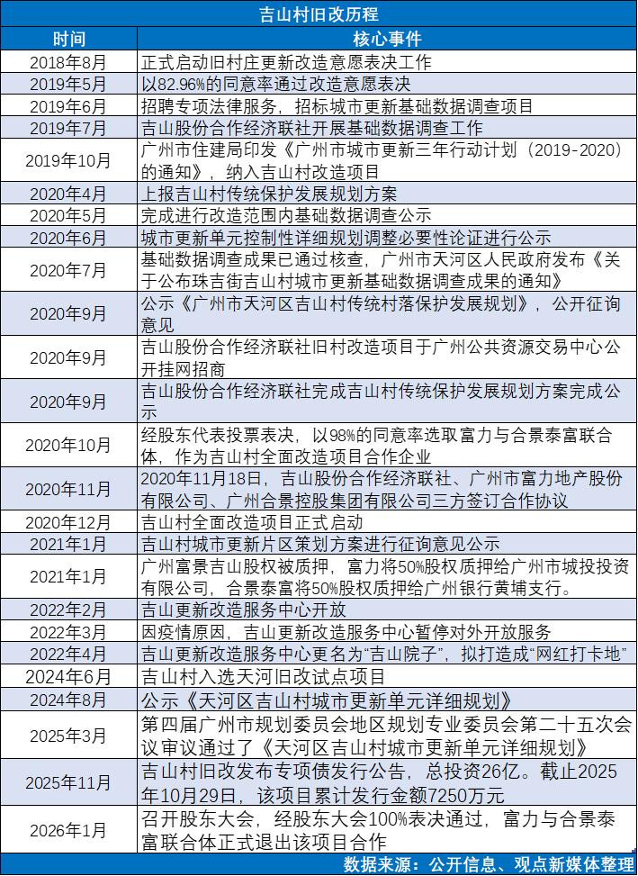 这次退出吉山村旧改舞台的法律主体为广州富景吉山房地产诱导有限公司(下称“富景吉山”),原由富力和合景泰富各握股50%。