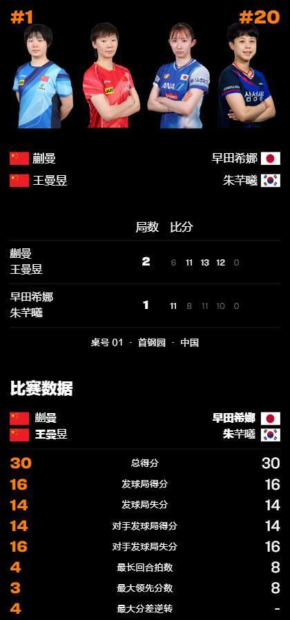 要津的第三局,早田希娜/朱芊曦再次抢出了一个可以开局,况且迟缓在中局将上风扩大到了8-4,在王曼昱/蒯曼将比分悲痛7-9时,感到压力的早田希娜/朱芊曦也唐突叫了一个暂停转化,重返赛场之后,王曼昱/蒯曼延续了强势的追分势头,刚烈以13-11拿下了这一局。